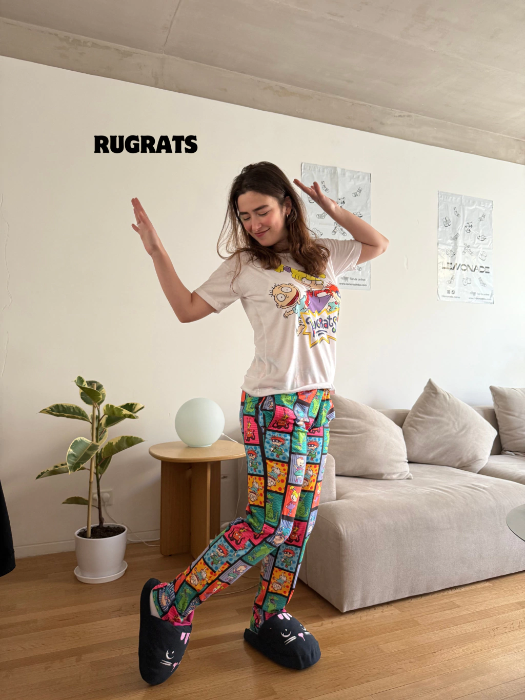 👕🎨 Mixto: pantalón estampado y remera blanca con un dibujo a juego.